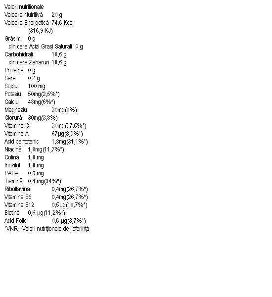 *Izomaltuloză, acidifiant (acid citric), corector de aciditate (bicarbonat de sodiu), citrat de potasiu, citrat tricalcic, citrat trisodic, trimagneziu citrat, aromă, agent de îngroșare (gumă xantan), carbonat de magneziu, fosfat tricalcic, clorură de sodiu, vitamina C (acid ascorbic), complex de vitamine B (D-pantetonat de calciu, nicotinamidă, inozitol, bitartrat de colină, acid para aminobenzoic, ciancobalamină, mononitrat de tiamină, riboflavină, clorhidrat de piridoxină, acid pteroilmonoglutamic, D-biotină), beta caroten (pro-vitamina A), coloranți (carmin – pentru aroma de punch de fructe, colorant verde S – pentru aroma de lămâie – lămâie verde).