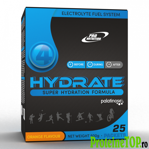 4 Hydrate, este o băutură instant cu aport de carbohidrați, electroliți și vitamine. Pierderea electroliţilor prin transpiraţie în timpul efortului fizic prelungit duce la deshidratare şi dezechilibrul mineralelor, scăzând performanţa.